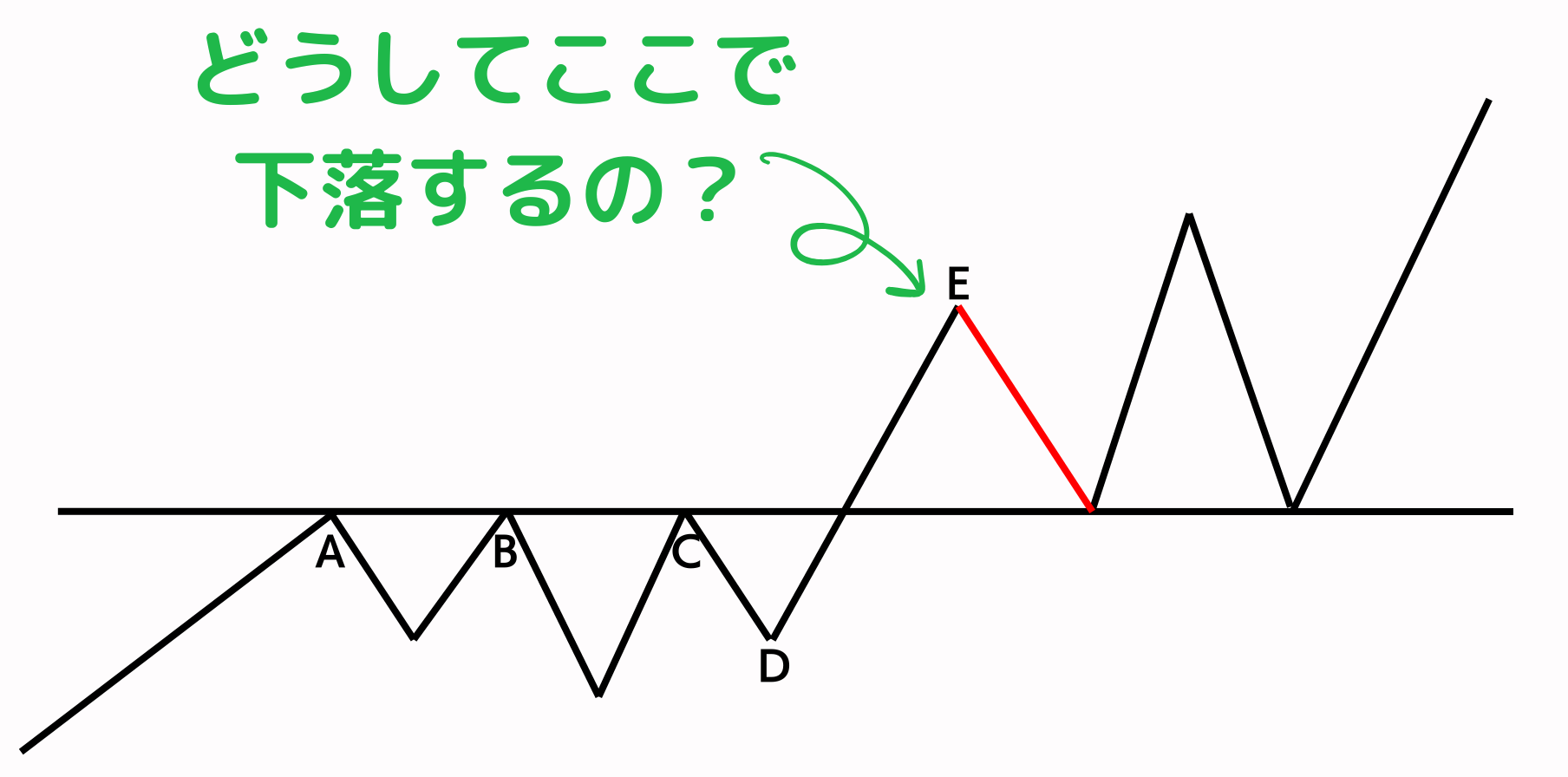 E点から下落する際中に下降トレンドが発生したと勘違いし新規の売りを入れるトレーダーが多いためチャートは下落します。
