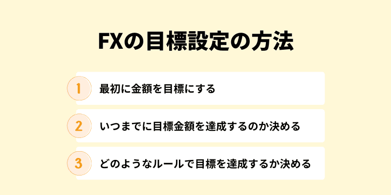 まずは、FXの目標設定の方法について順番に紹介します。基本的には以下の手順に沿って細かく決めていけば、目標を具体的にイメージしやすくなります。