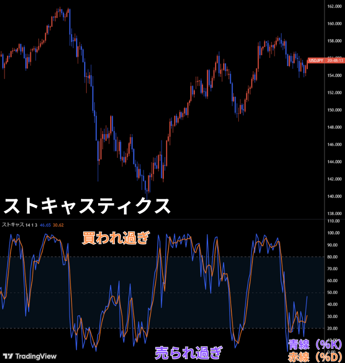 下図のように、2本の線が80%以上の場合は買われ過ぎ、20%以下の場合は売られ過ぎと判断してトレードするのが有効です。