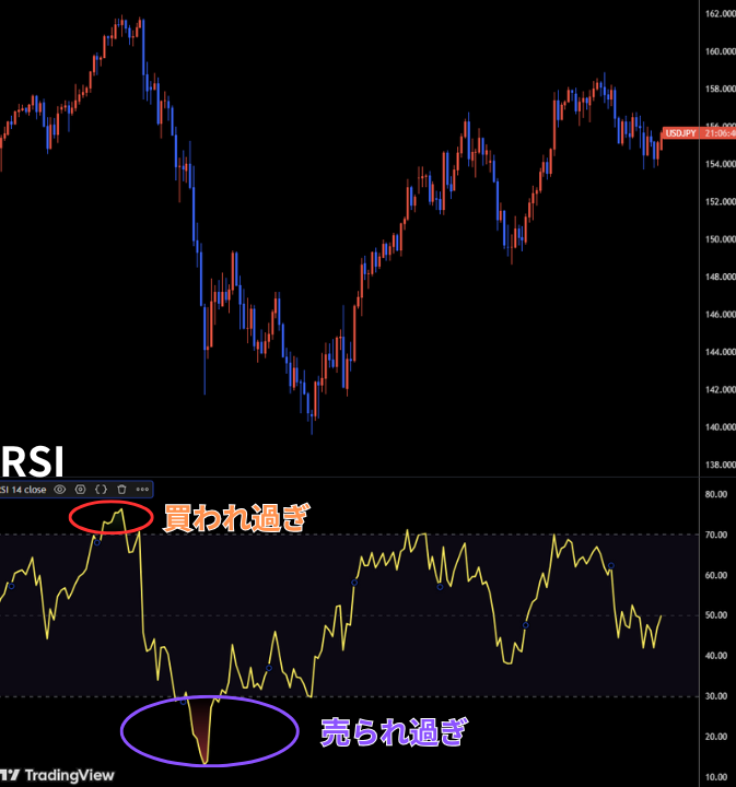 下図のように、RSIが70%以上の場合は買われ過ぎ、逆に30%以下の場合は売られ過ぎの相場としてトレードするのが効果的です。