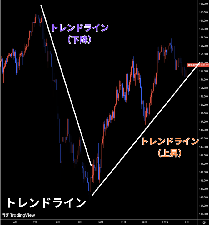 トレンドラインとは、相場の方向性を視覚的にわかりやすくするためにチャート上に引く線のことで、以下の2種類に分けられます。