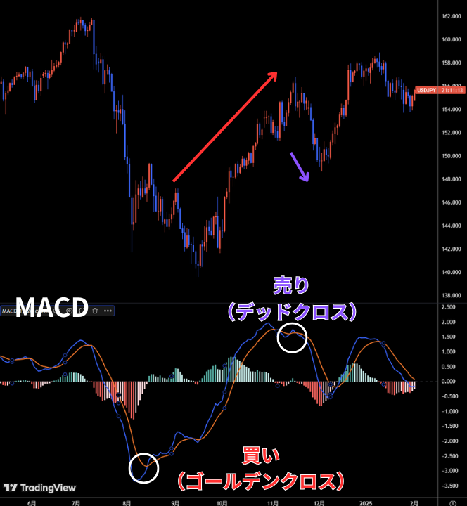 MACDでは、下図のMACDラインとシグナルラインの2つのラインで相場分析するのが有効です。