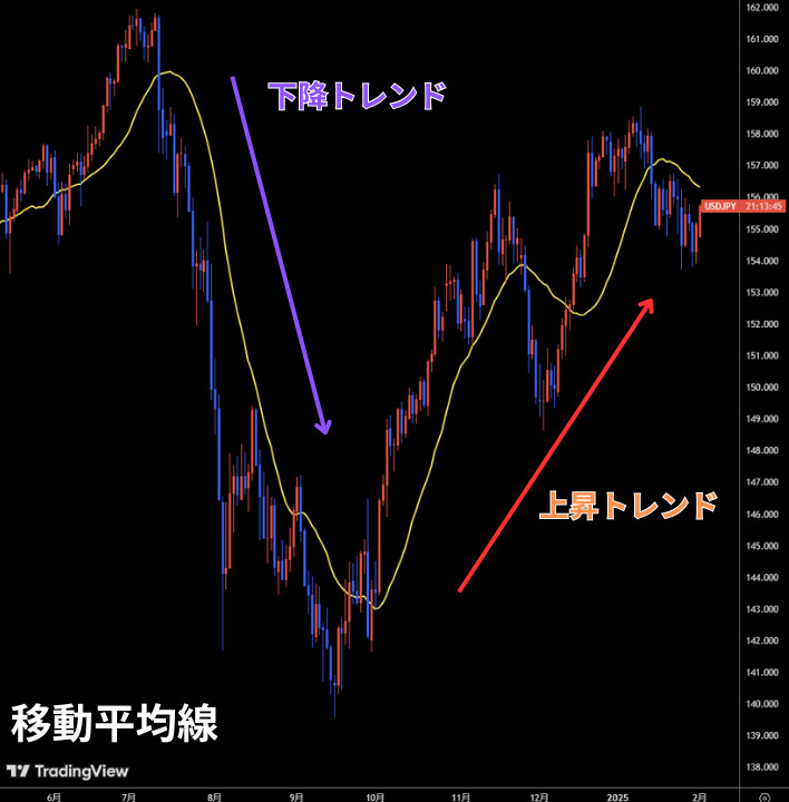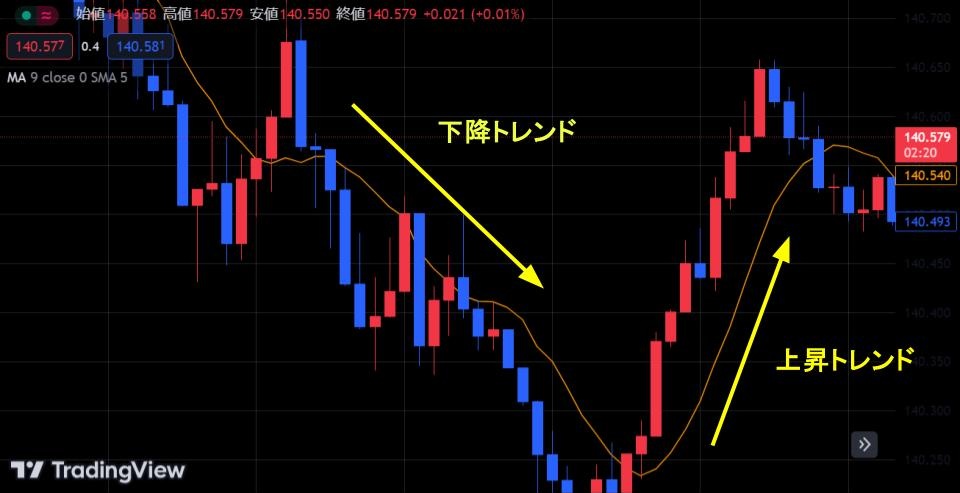 下図のように、移動平均線が下向きであれば下降トレンド、上向きであれば上昇トレンドと判断できます。