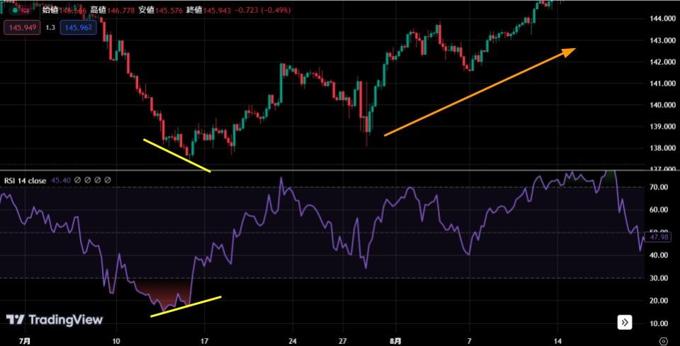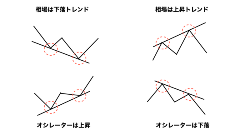 下図のようにチャートが安値を更新しているのに対し、オシレーター系テクニカル指標が切り上がっているときは、上昇トレンドに転じる可能性があると判断できます。