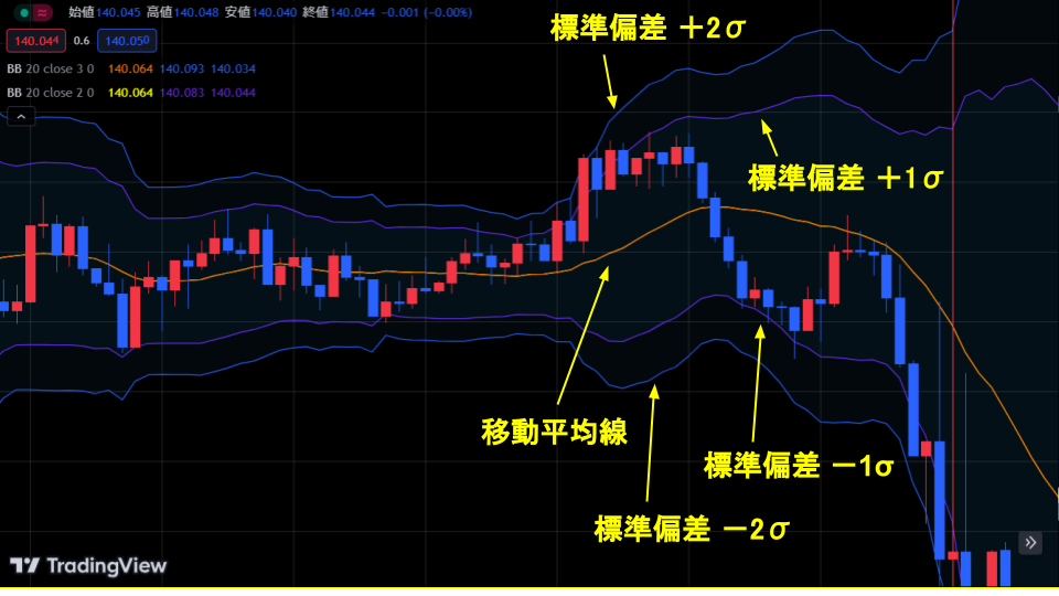 ボリンジャーバンドとは、下図のように移動平均線の上下に標準偏差が引かれる、値動きの変動幅を表示するテクニカル指標です。