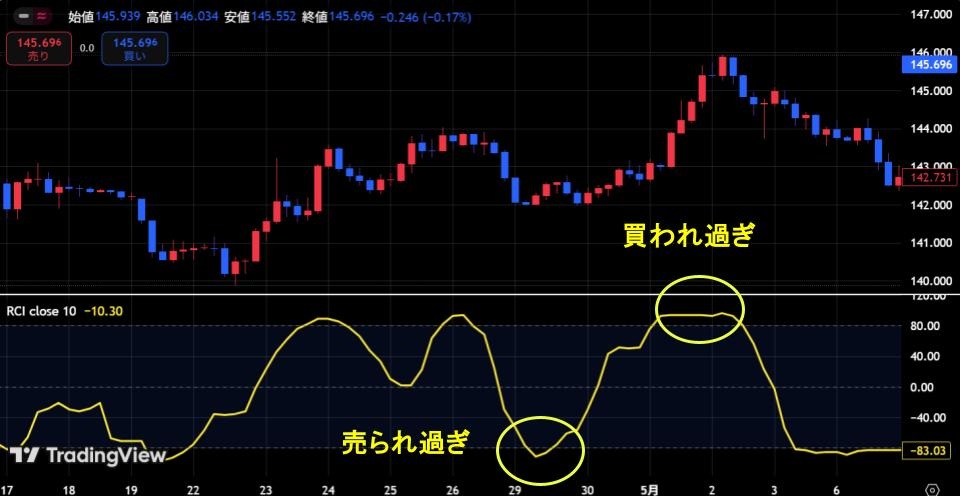 なお、RCIの値は-100%から+100%の範囲で変動し、下図のように+80%以上であれば買われ過ぎ、-80%以下であれば売られ過ぎと判断するのが基本です。
