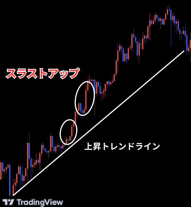 上昇トレンド中にスラストアップが何度か出現すると、非常に強い上昇トレンドであると判断でき、長期の上昇トレンド継続やその後強い上昇を引き起こす可能性があります。