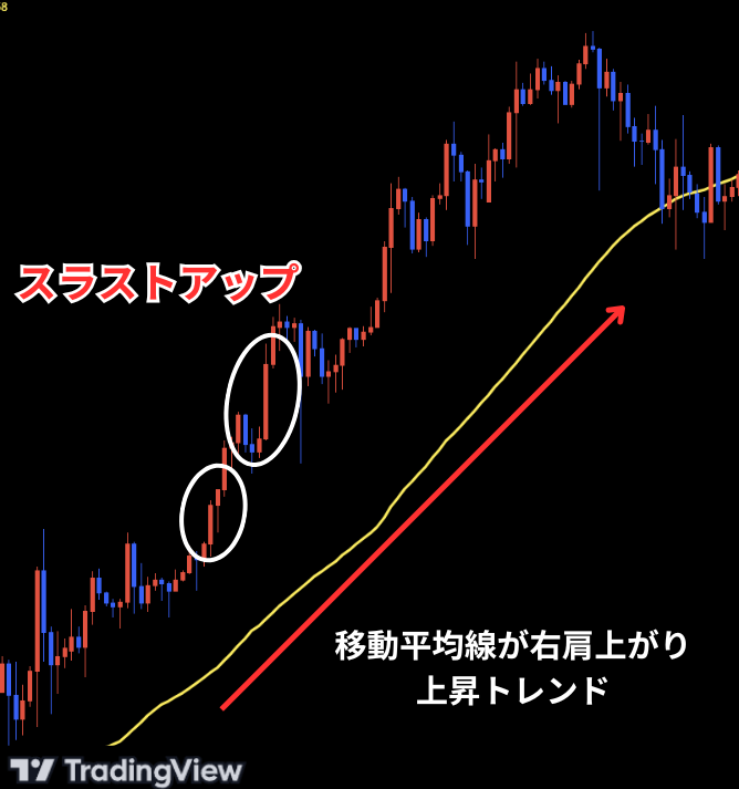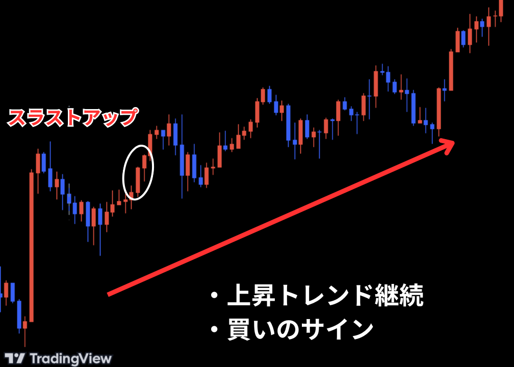 スラストアップは上昇トレンド中に出現することで、上昇トレンドの継続を示唆します。