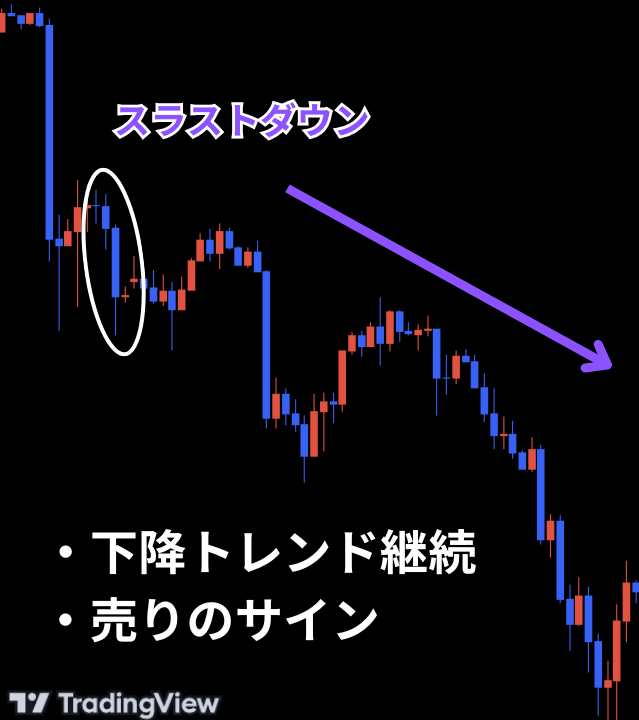スラストダウンは下降トレンド中に出現することで、下降トレンドの継続を示唆します。