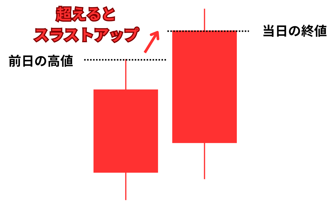 スラストアップは、前日(1本前)のローソク足の高値を、当日のローソク足の終値が上回るパターンです。