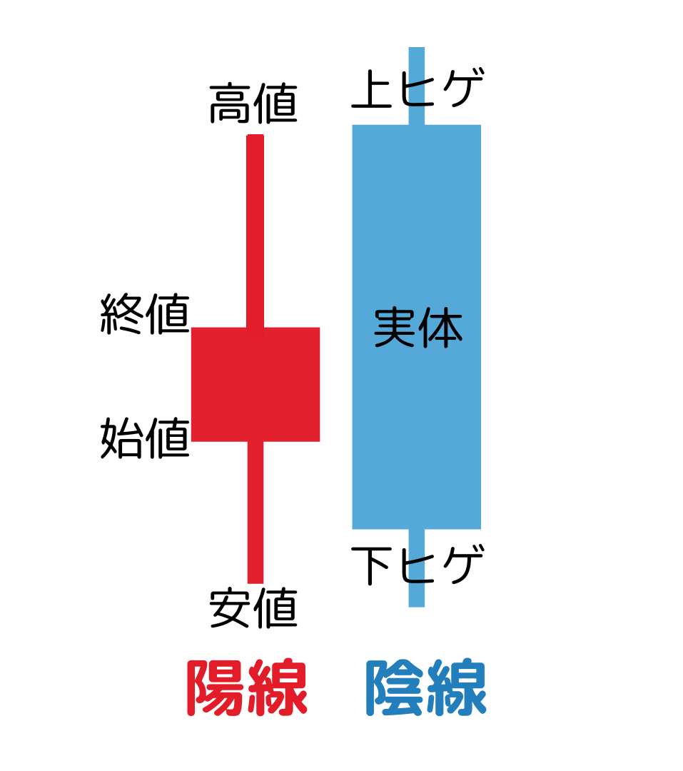 FXのローソク足は、時間足の始値(はじめね)・高値(たかね)・安値(やすね)・終値(おわりね)を視覚的に表します。