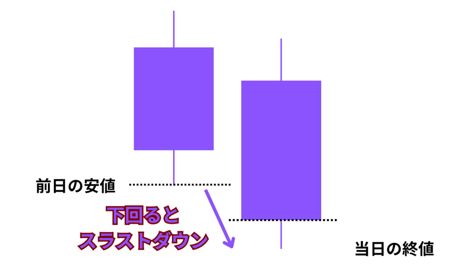 スラストダウンは、前日(1本前)のローソク足の安値を、当日のローソク足の終値が下回るパターンです。