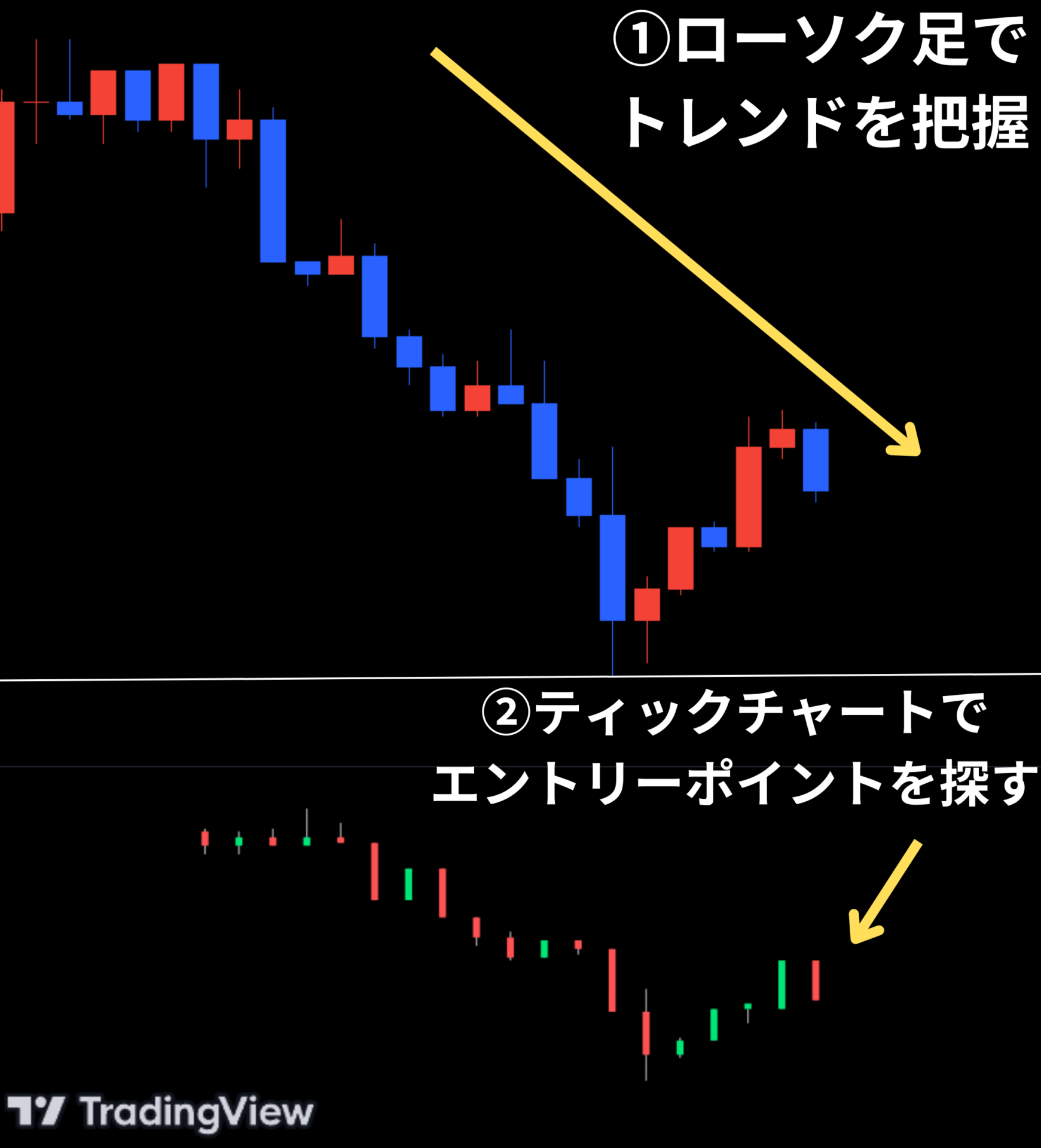 上記3つのティックチャートをトレードで使う手法を解説していきます。