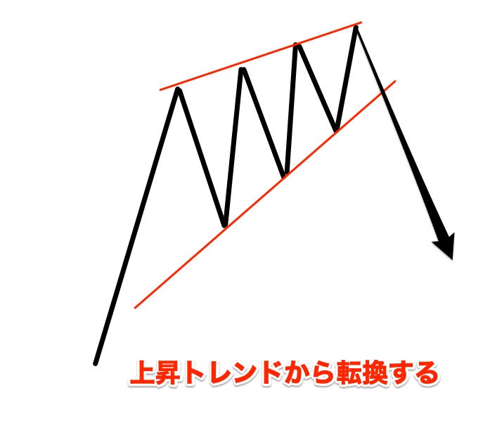 トレンド反転型の上昇ウェッジとは、天井圏で出現するパターンです。
