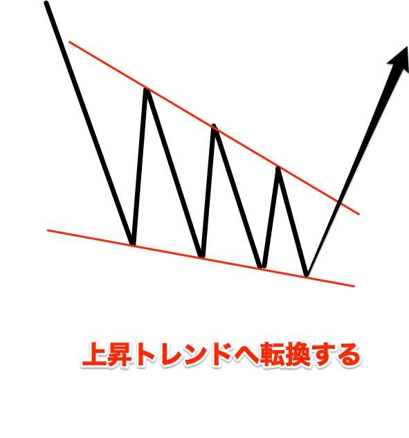 トレンド反転型の下降ウェッジは、底値圏から上昇方向へ転換する場合に出現しやすいチャートパターンです。