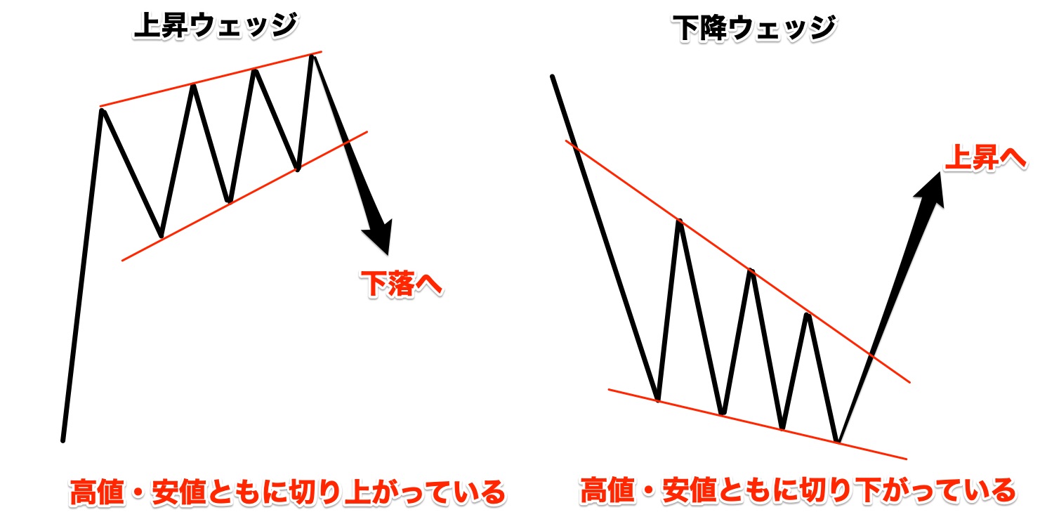 ウェッジとは、高値と安値が同じ向きで切り上げもしくは切り下げながら値幅が狭くなっていくチャートパターンで、以下の2つがあります。