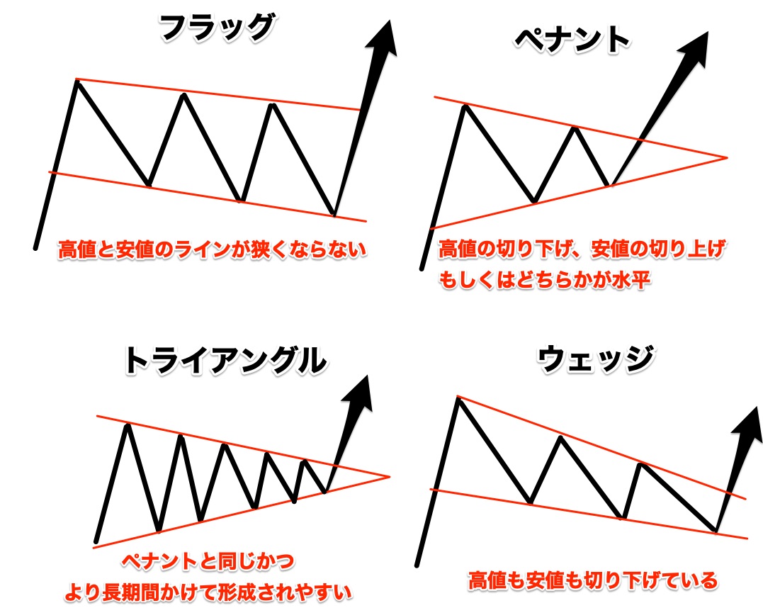 それぞれのチャートパターンとウェッジの違いをまとめると以下の通りです。