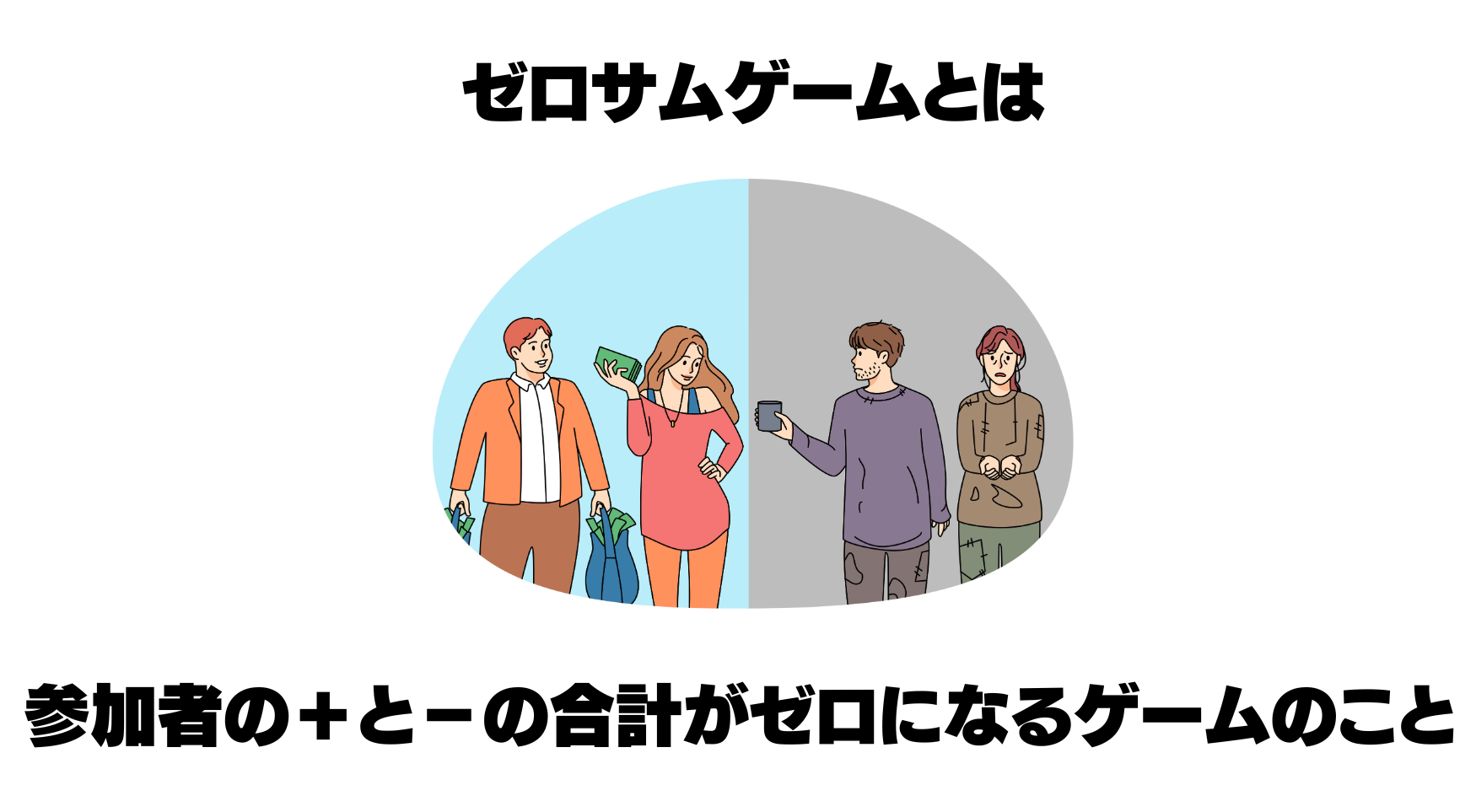 ゼロサムゲームとは、一方が利益を得たらもう一方は同じ分損をする=参加者のプラスとマイナスの合計がゼロになるゲームのことです。