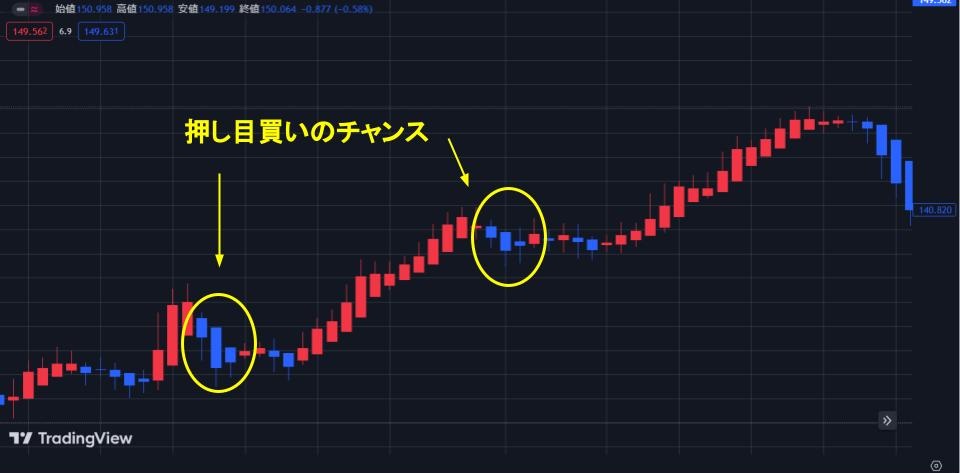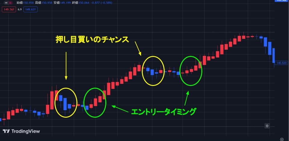 平均足を使ったおすすめのトレード手法は、順張りの一種である押し目買い・戻り売りを狙う方法です。