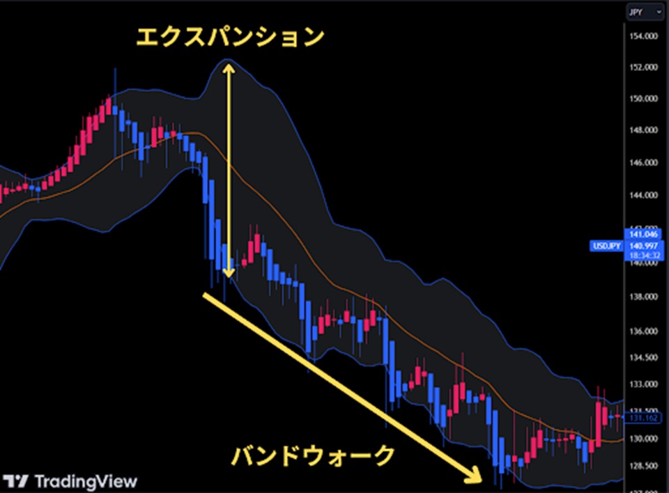 バンド(移動平均線と標準偏差の幅)は値動きが緩やかだと収縮し、トレンド相場になると拡大する傾向があります。