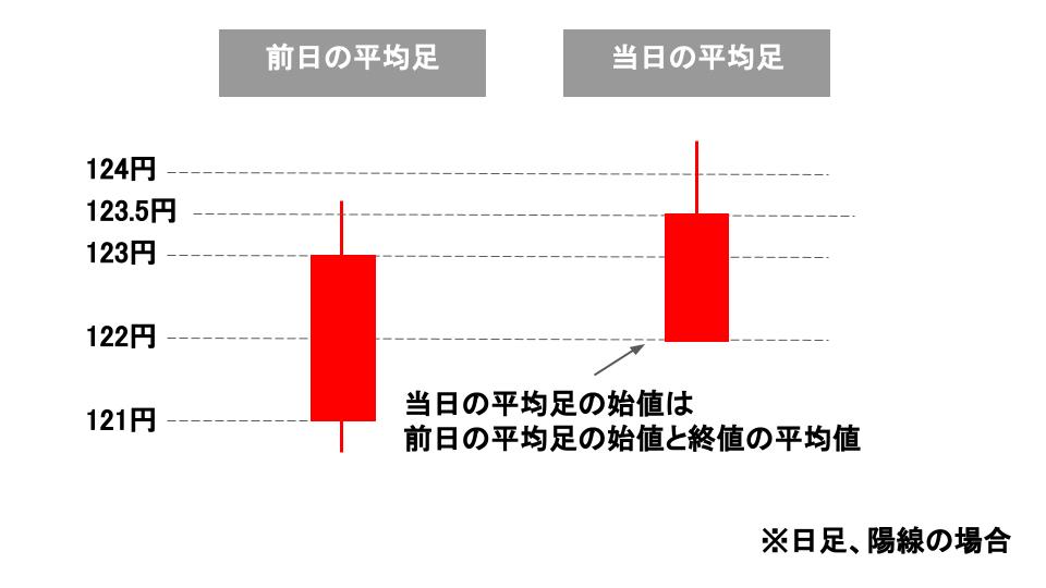 例えば、日足の場合、前日の平均足の始値が121円、終値が123円であれば、平均足の始値は122円となります。