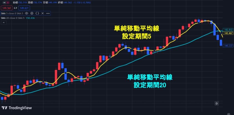 下図では、期間5と20の単純移動平均線が両方とも上向きになっているため、上昇トレンドと把握できます。