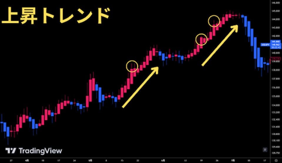 そのため、上昇トレンド時には陽線が多く出現し、下降トレンド時には陰線が連続して出現する特徴があります。