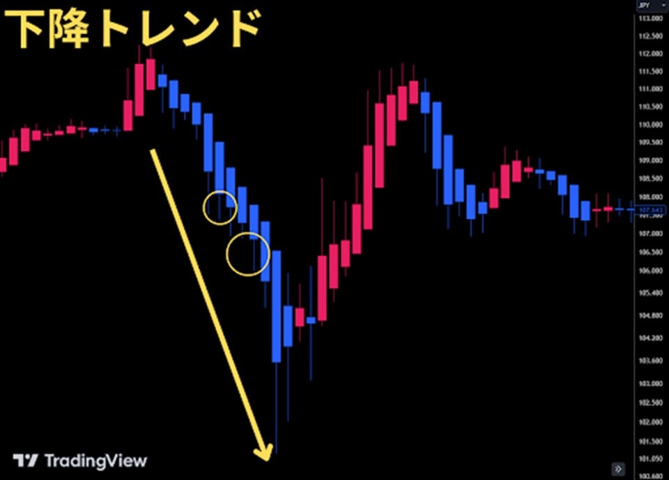 下ヒゲや実体が短い陰線が多く出現するときは、下降トレンドが形成されない可能性があるのでエントリーを見送るのがおすすめです。