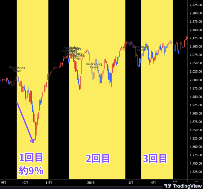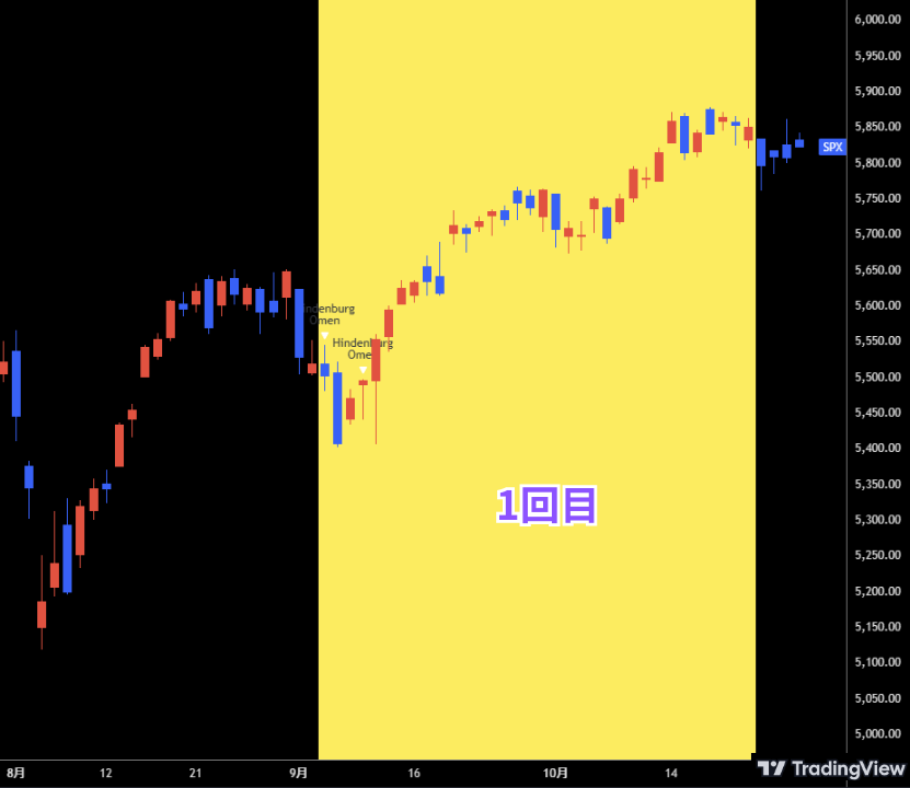 ここからは、米国の代表的な株価指数のS&P500の過去チャートで、ヒンデンブルグオーメンが発生したケースを見ていきましょう。
