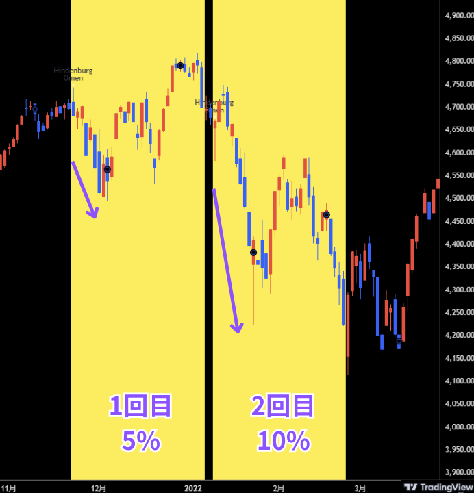 ヒンデンブルグオーメンが点灯し、5%以上の下落が発生したケースを紹介します。