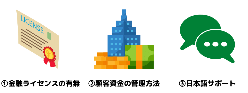 安全な海外FX業者を選ぶ際には、金融ライセンスを保有する他に先ほど紹介した顧客資金の管理方法、日本語サポートの有無などもしっかりと確認しておかなければなりません。