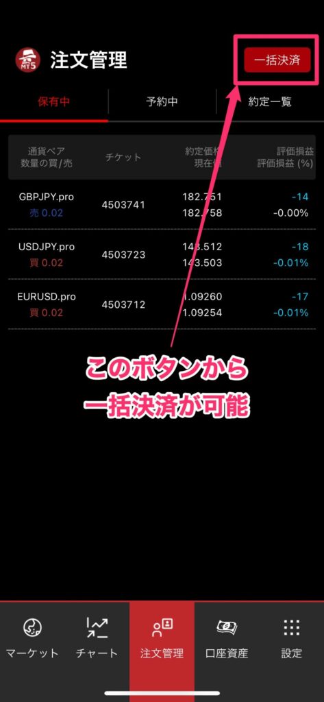従来のMT4では複数ポジションの決済ができません。そのため、2つ以上ポジションを保有している場合は、1つずつ順番に決済する必要があります。