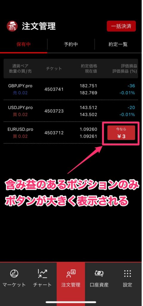 よって、一目でどのポジションを決済すれば利益を確定できるのかがわかります。