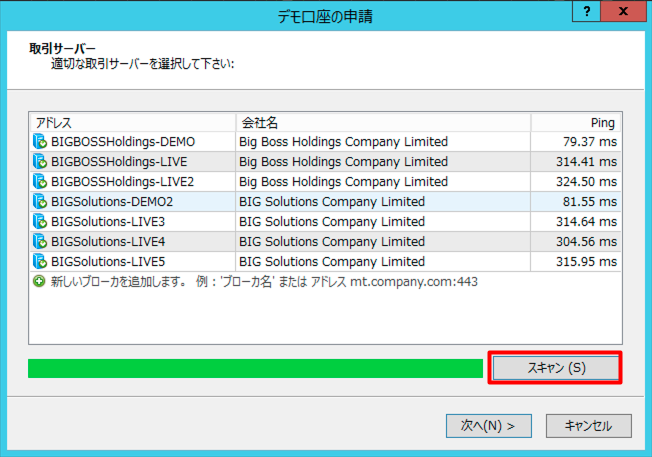 また、登録したサーバー名が表示されていない場合は「ファイル」「デモ口座の申請」からサーバーをスキャンする必要があります。