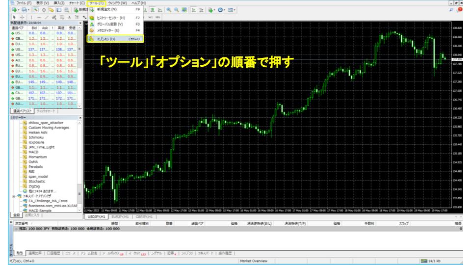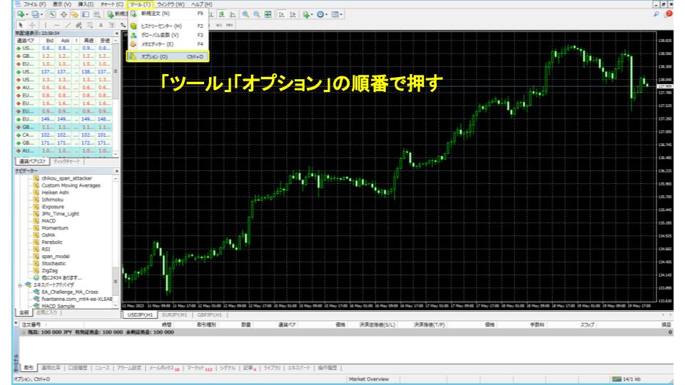 次にMT4を起動してログインをします。ログインが完了したら「ツール」「オプション」を押します。