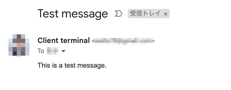 MT4からテスト送信をすると、件名が「Test messeage」、本文に「This is test messeage」と記載されたメールが届きます。