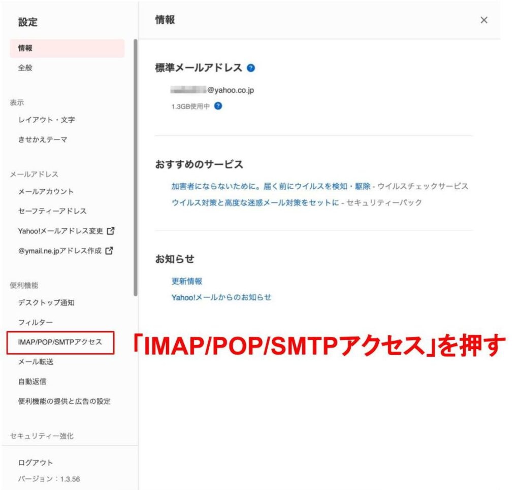設定画面が表示されるので、左側にある「便利機能」から「IMAP/POP/SMTPアクセス」を押してみましょう。
