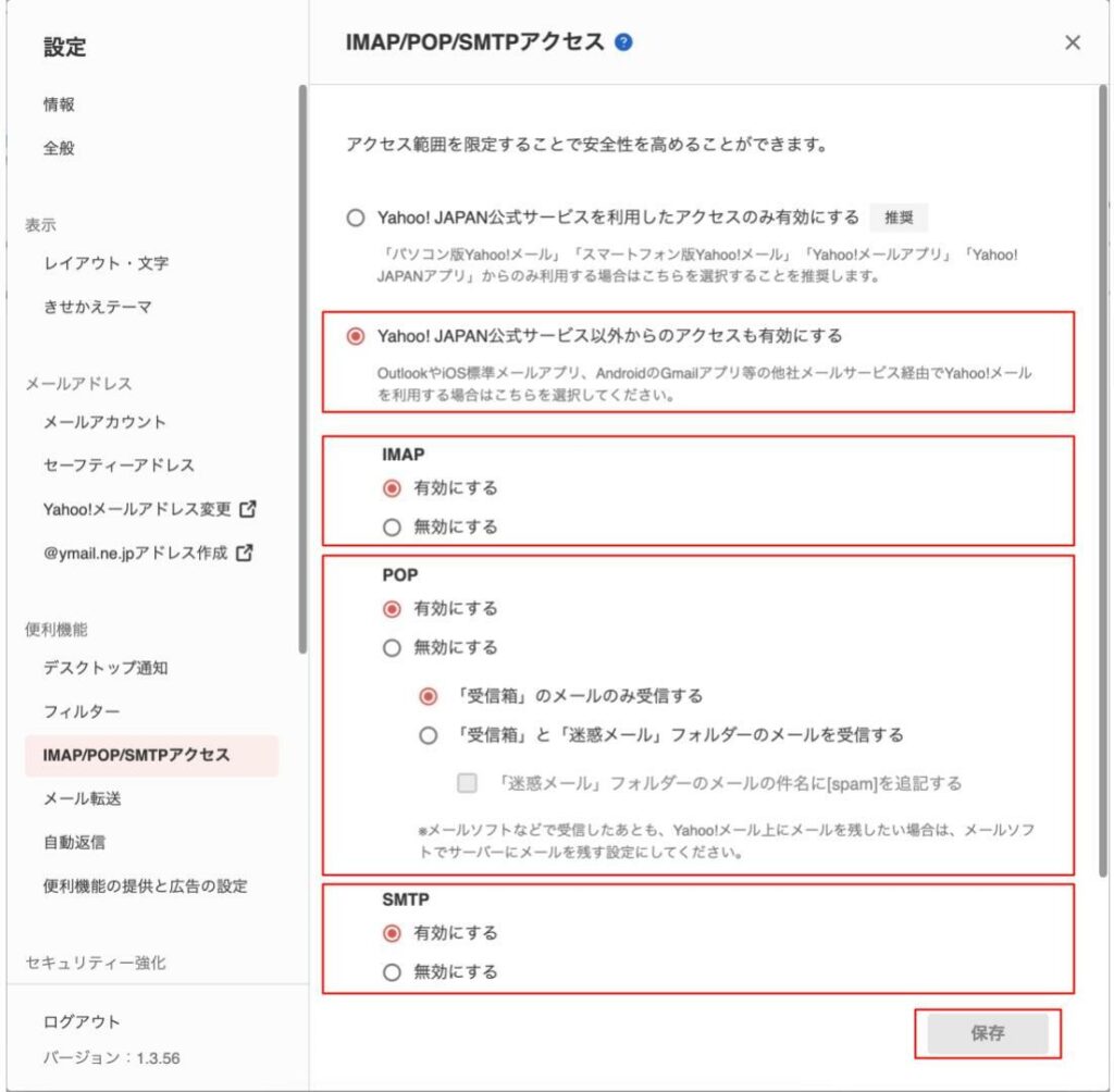 POPについては『「受信箱」のメールのみ受信する』にもチェックを入れます。最後に「保存」を押せばYahoo!メール側の設定は完了です。