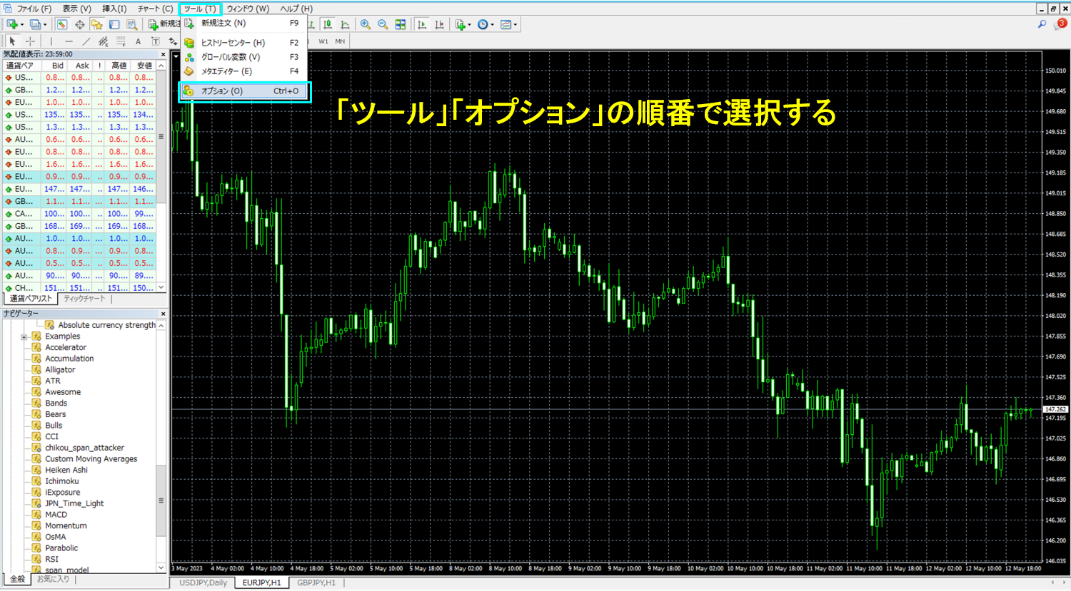 MT4の画面上にある「ツール」から「オプション」を選択します。