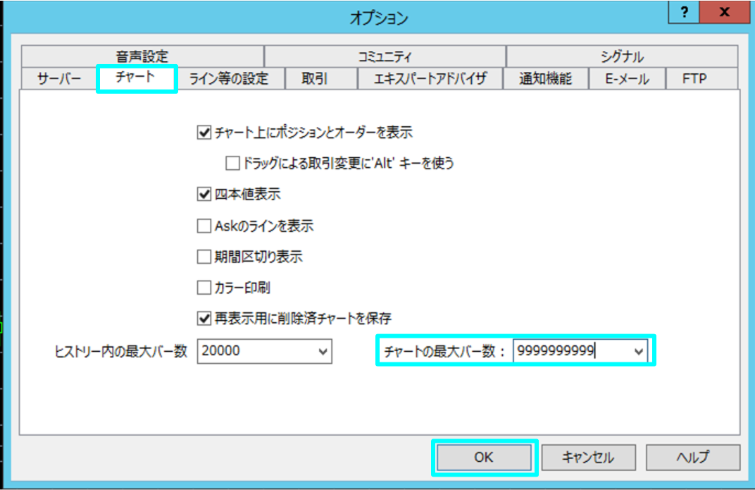チャートの最大バー数の数値に「99999999999」を入れて設定します。入力が完了したら「OK」を押します。