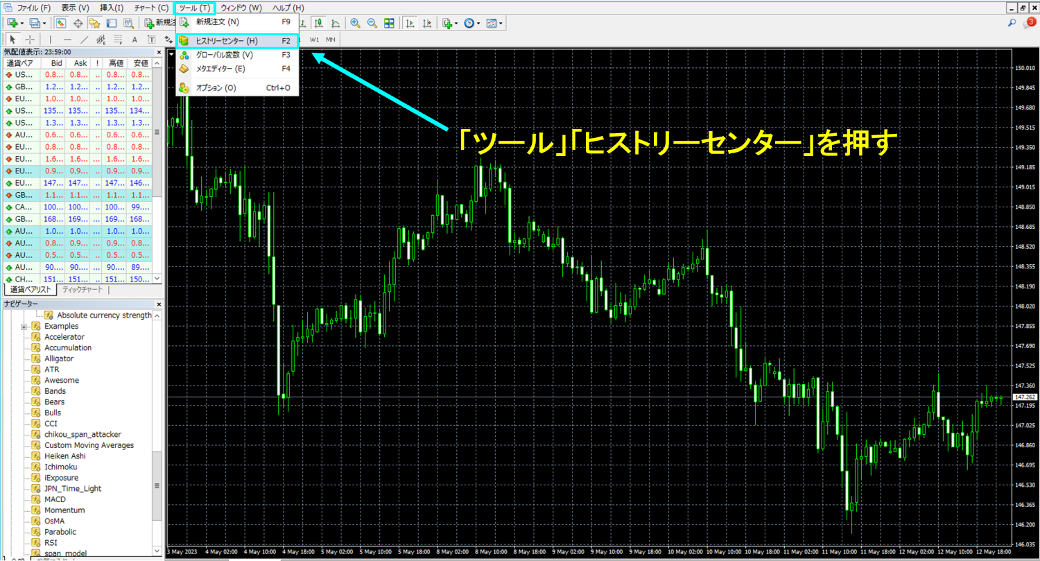 MT4の画面上にある「ツール」から「ヒストリーセンター」を選択します。