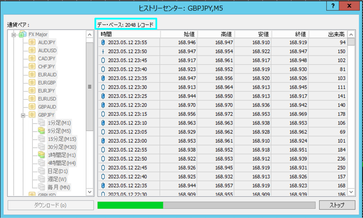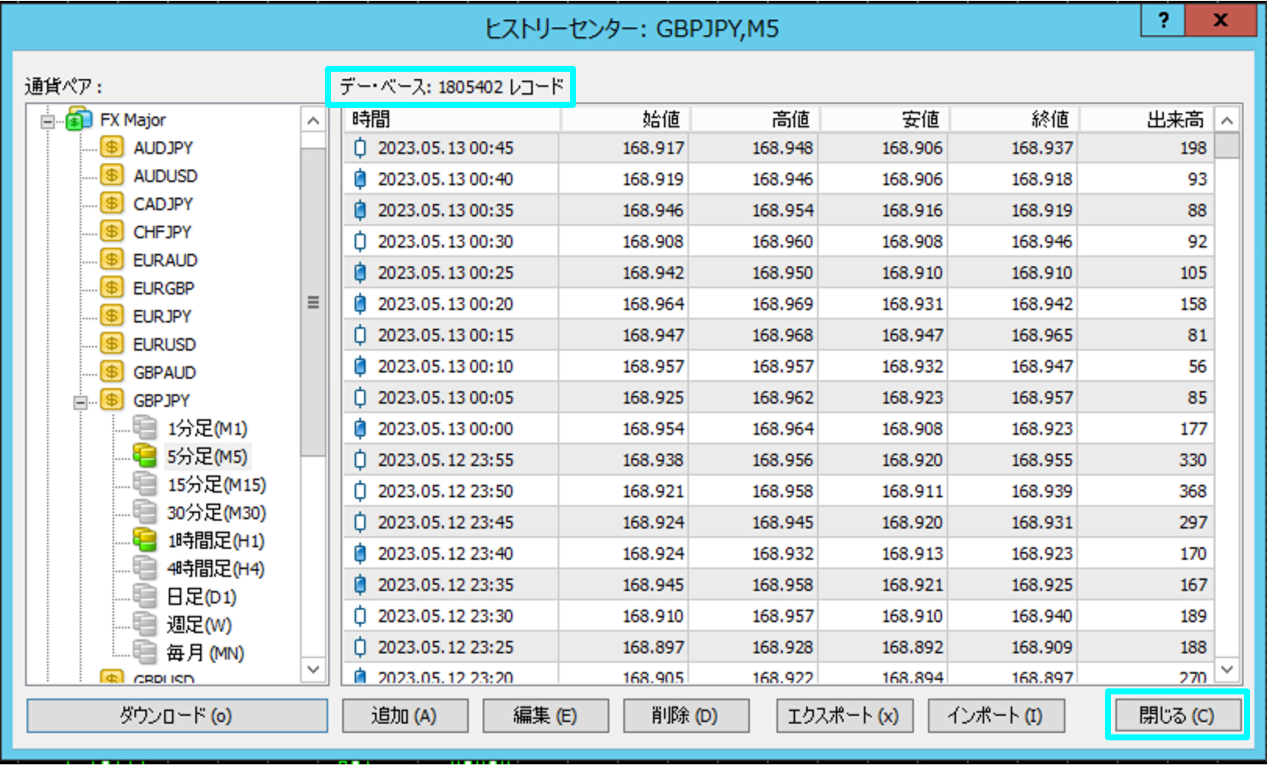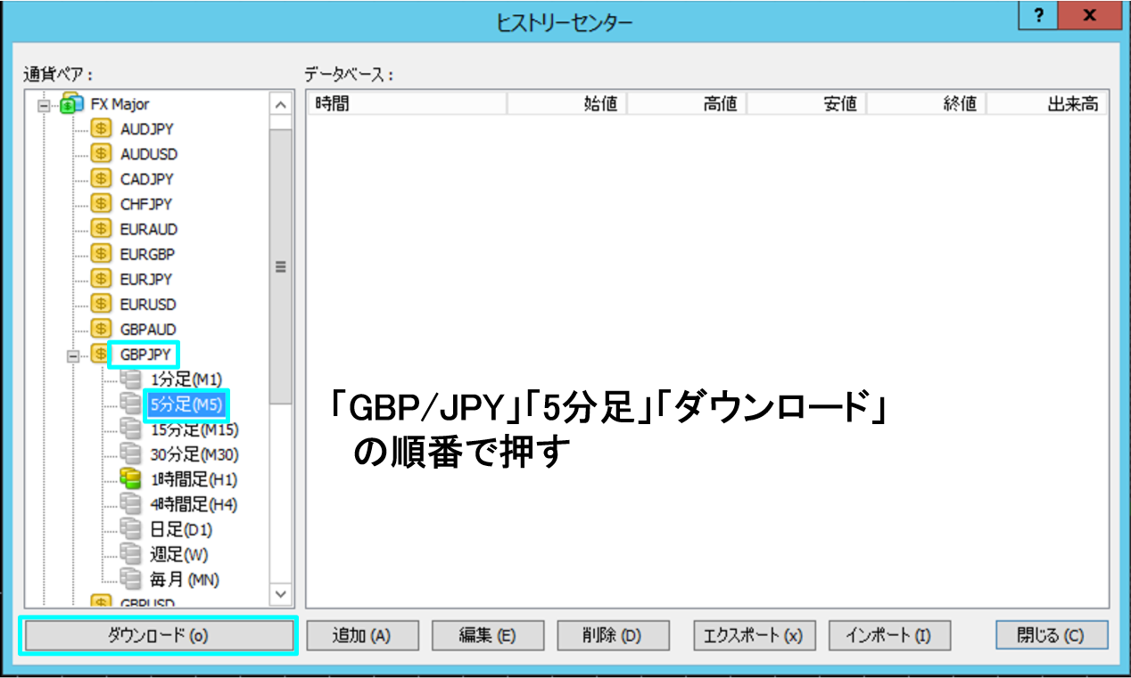 今回はGBP/JPY(ポンド/円)の5分足のヒストリカルデータのダウンロード方法を例に解説します。