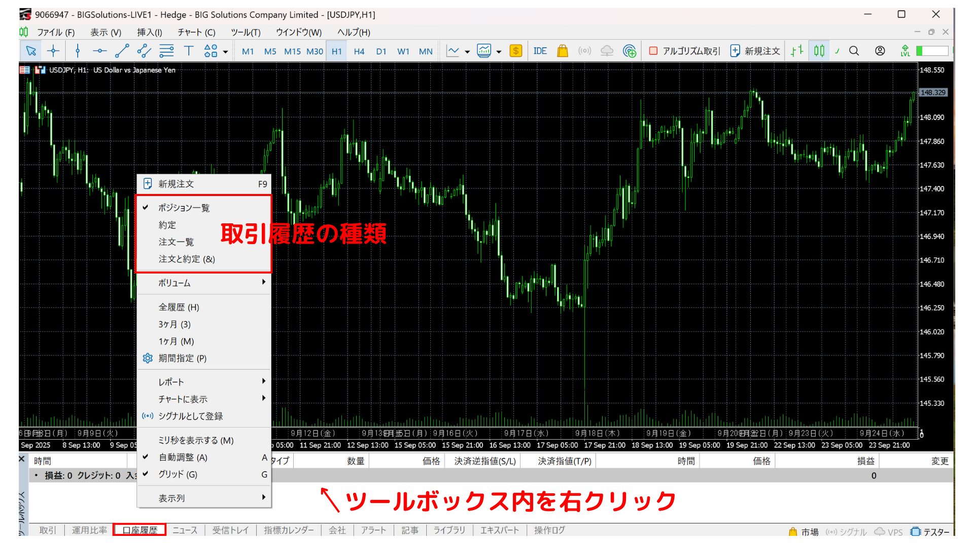 口座履歴のタブを開き、ツールボックス内の余白を右クリックするとメニューバーが表示されます。ここから、表示する取引履歴の種類を選択することができます。