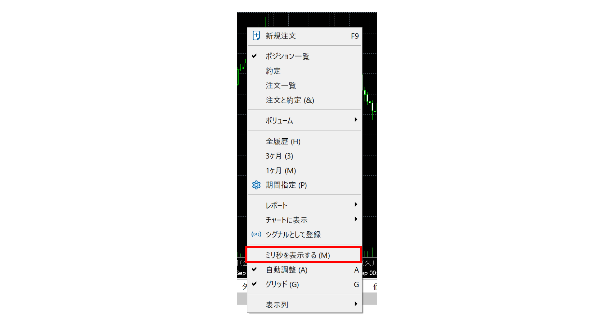 口座履歴内の余白を右クリックし、「ミリ秒を表示する」を選択することで変更可能です。