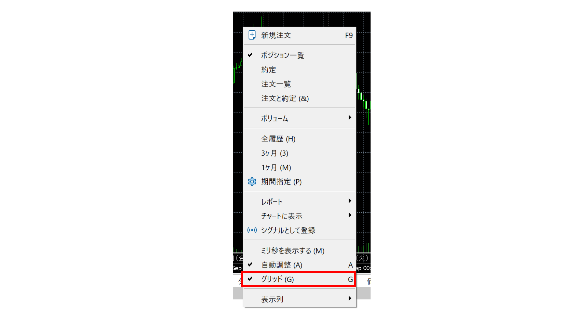 口座履歴内の余白を右クリックし、「グリッド」を選択すると、口座履歴の表にグリッド(枠線)が表示されます。