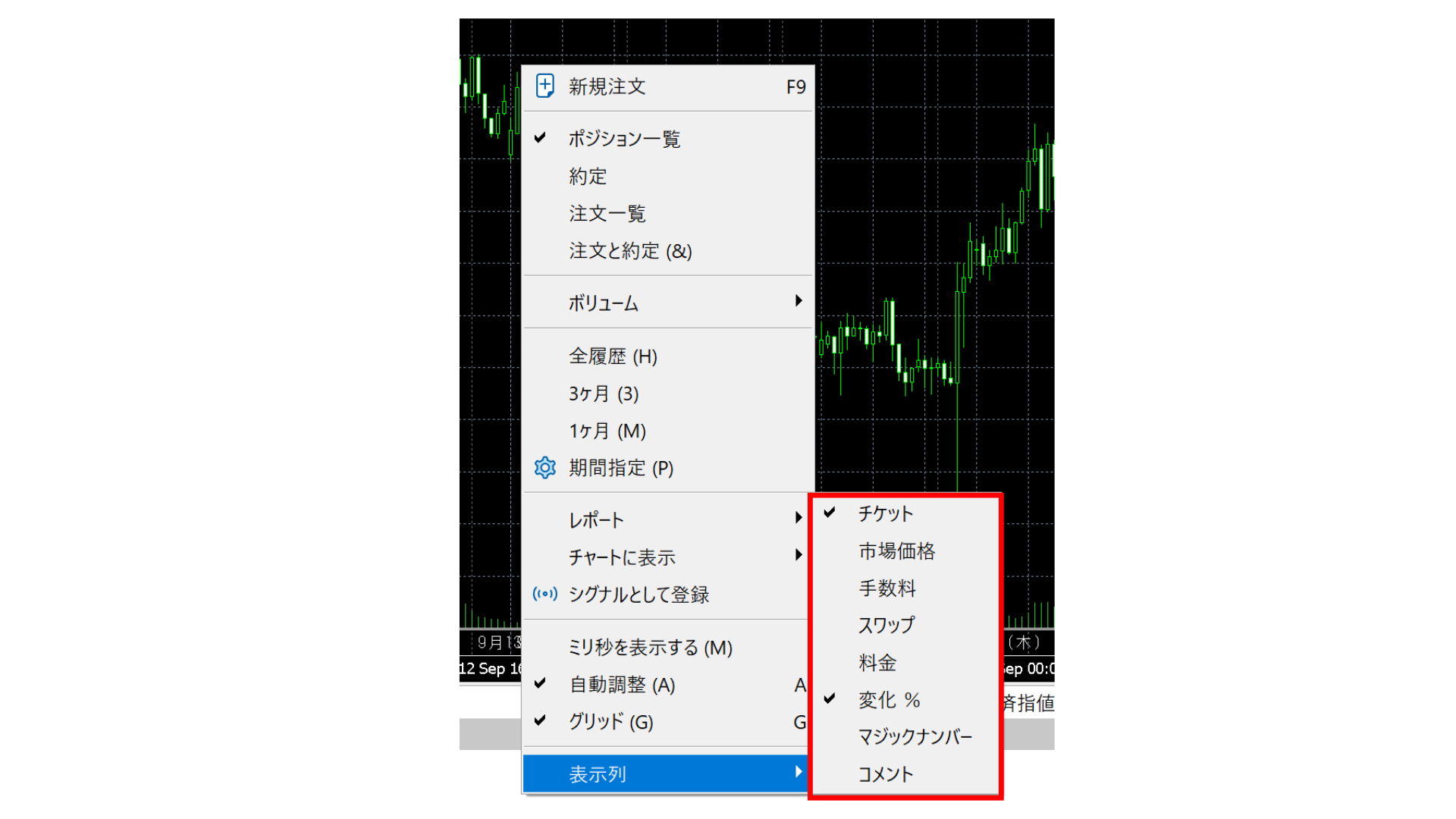 口座履歴内の余白を右クリックし、「表示列」では「手数料」や「スワップ」等の表示変更が行えます。