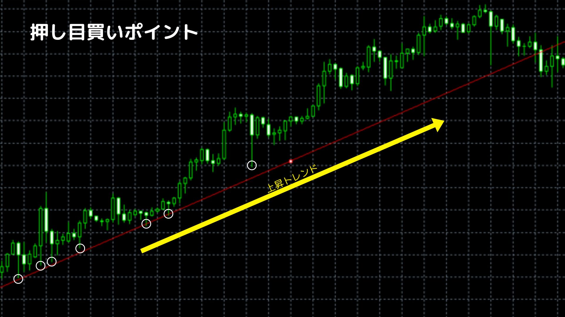 押し目買いとは、上昇トレンドで価格が一時的に下がったときに買いエントリーをする取引手法のことです。