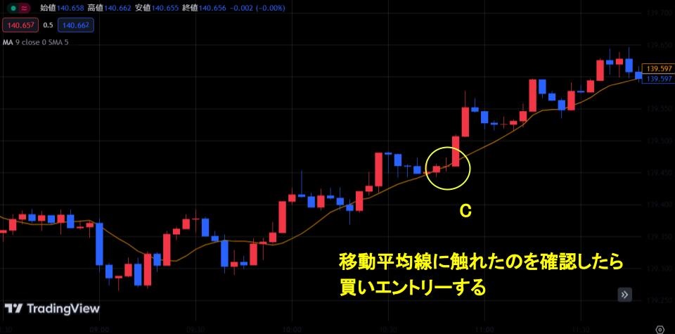 移動平均線を活用して押し目買いをする際は、下図のように移動平均線付近まで価格が下がったタイミング(C)に買い注文をするのが基本です。