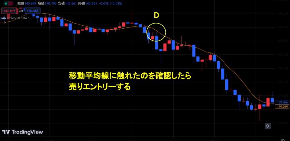 下図のように、移動平均線付近まで価格が上がったとき(D)に反落することを予測して売りエントリーをしましょう。