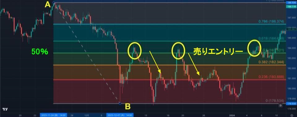 下図では、50%ラインで戻り目が発生することが予測できるため、50%ライン付近まで価格が上昇したときに売りエントリーをするのが有効であると判断できます。